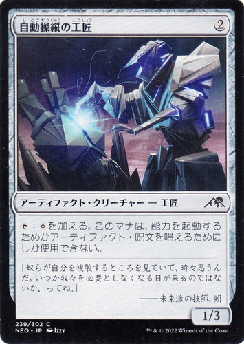 ![]() ![]() | NEO 239 自動操縦の工匠 アーティファクト・クリーチャー 神河:輝ける世界 C 色:無色 サブタイプ:工匠 マナコスト:(2) パワー:1 タフネス:3 [T]:(無)を加える。このマナは、能力を起動するためかアーティファクト・呪文を唱えるためにしか使用できない。 「奴らが自分を複製するところを見ていて、時々思うんだ。いつか我々を必要としなくなる日が来るのではないか、ってね」 ――未来派の技師、朔 illust:IZZY |