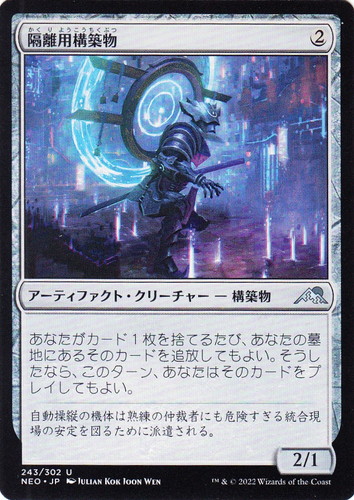 ![]() ![]() | NEO 243 隔離用構築物 アーティファクト・クリーチャー 神河:輝ける世界 U 色:無色 サブタイプ:構築物 マナコスト:(2) パワー:2 タフネス:1 あなたがカード1枚を捨てるたび、あなたの墓地にあるそのカードを追放してもよい。そうしたなら、このターン、あなたはそのカードをプレイしてもよい。 自動操縦の機体は熟練者の仲裁者にも危険すぎる統合現場の安定を図るために派遣される。 illust:JULIAN KOK JOON WEN |