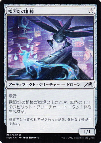 ![]() ![]() | NEO 258 探照灯の相棒 アーティファクト・クリーチャー 神河:輝ける世界 C 色:無色 サブタイプ:ドローン マナコスト:(3) パワー:1 タフネス:1 飛行 探照灯の相棒が戦場に出たとき、無色の1/1のスピリット・クリーチャー・トークン1体を生成する。 精霊界と物質の世界が交わった結果、奇妙な友情が生まれた。 illust:RUDY SISWANTO |