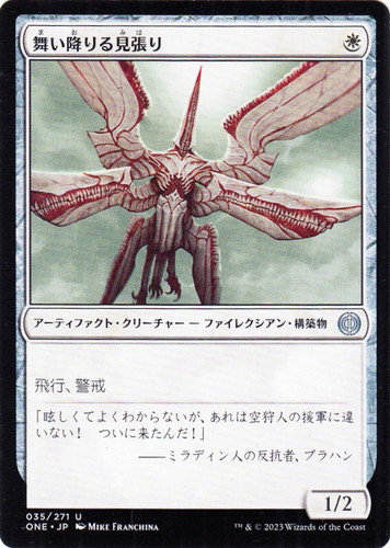 ![]() ![]() | ONE 035 舞い降りる見張り アーティファクト・クリーチャー ファイレクシア:完全なる統一 U 色:白 サブタイプ:ファイレクシアン・構築物 マナコスト:(白) パワー:1 タフネス:2 飛行、警戒 「眩しくてよくわからないが、あれは空狩人の援軍に違いない!ついに来たんだ!」 ――ミラディン人の反抗者、プラハン illust:MIKE FRANCHINA |