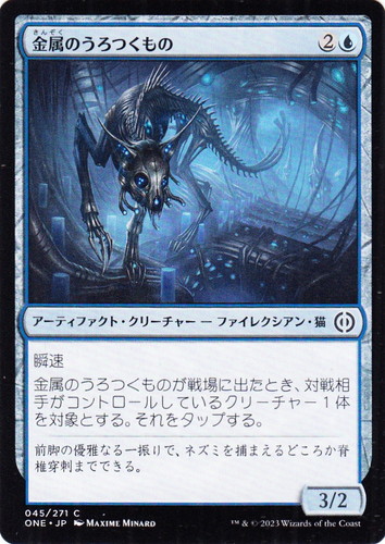 ![]() ![]() | ONE 045 金属のうろつくもの アーティファクト・クリーチャー ファイレクシア:完全なる統一 C 色:青 サブタイプ:ファイレクシアン・猫 マナコスト:(2)(青) パワー:3 タフネス:2 瞬速 金属のうろつくものが戦場に出たとき、対戦相手がコントロールしているクリーチャー1体を対象とする。それをタップする。 前脚の優雅なる一振りで、ネズミを捕まえるどころか脊椎穿刺までできる。 illust:MAXIME MINARD |