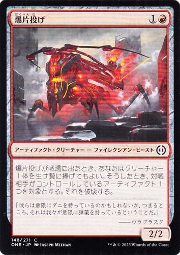 ![]() ![]() | ONE 148 爆片投げ アーティファクト・クリーチャー ファイレクシア:完全なる統一 C 色:赤 サブタイプ:ファイレクシアン・ビースト マナコスト:(1)(赤) パワー:2 タフネス:2 爆片投げが戦場に出たとき、あなたはクリーチャー1体を生け贄に捧げてもよい。そうしたとき、対戦相手がコントロールしているアーティファクト1つを対象とする。それを破壊する。 「彼らは無限にダニを持っているのかもしれないが、つまるところ、それは我々が無限に弾薬を持っているということだ。」 ――ウラブラスク illust:JOSEPH MEEHAN |