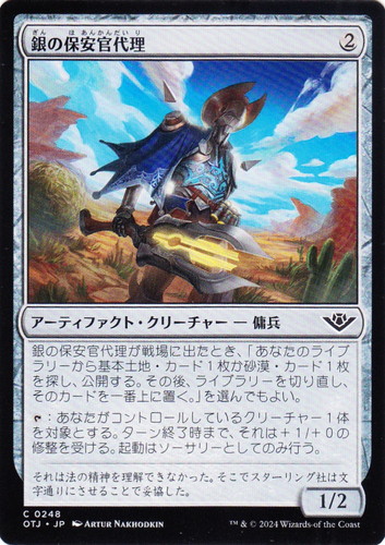 ![]() ![]() | OTJ 0248 銀の保安官代理 アーティファクト・クリーチャー サンダー・ジャンクションの無法者 C 色:無色 サブタイプ:傭兵 マナコスト:(2) パワー:1 タフネス:2 銀の保安官代理が戦場に出たとき、「あなたのライブラリーから基本土地・カード1枚か砂漠・カード1枚を探し、公開する。その後、ライブラリーを切り直し、そのカードを一番上に置く。」を選んでもよい。 [T]:あなたがコントロールしているクリーチャー1体を対象とする。ターン終了時まで、それは+1/+0の修整を受ける。起動はソーサリーとしてのみ行う。 それは法の精神を理解できなかった。そこでスターリング社は文字通りにさせることで妥協した。 illust:ARTUR NAKHODKIN |