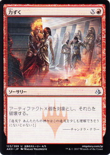 ![]() ![]() | AKH 123 力ずく ソーサリー アモンケット U 色:赤 マナコスト:(X)(赤) 透かしシンボル:プレインズウォーカー アーティファクトX個を対象とし、それらを破壊する。 「造反?あんたたちの神々はこの造反を少しも理解できそうにないじゃない!」 ――チャンドラ・ナラー illust:MAGALI VILLENEUVE |