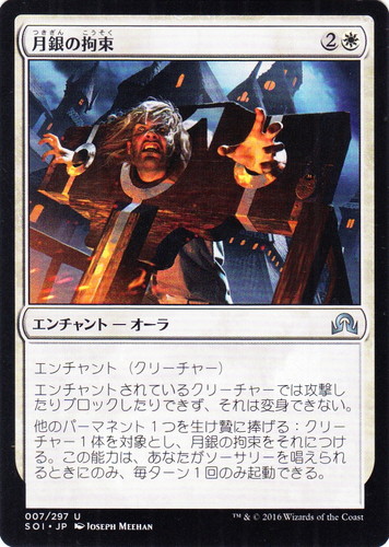 ![]() ![]() | SOI 007 月銀の拘束 エンチャント イニストラードを覆う影 U 色:白 サブタイプ:オーラ マナコスト:(2)(白) エンチャント(クリーチャー) エンチャントされているクリーチャーでは攻撃したりブロックしたりできず、それは変身できない。 他のパーマネント1つを生け贄に捧げる:クリーチャー1体を対象とし、月銀の拘束をそれにつける。この能力は、あなたがソーサリーを唱えられるときにのみ、毎ターン1回のみ起動できる。 illust:JOSEPH MEEHAN |
