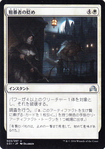 ![]() ![]() | SOI 023 粗暴者の貶め インスタント イニストラードを覆う影 U 色:白 マナコスト:(4)(白) パワーが4以上のクリーチャー1体を対象とし、それを破壊する。 調査を行う。(「(2), このアーティファクトを生け贄に捧げる:カードを1枚引く。」を持つ無色の手掛かり・アーティファクト・トークンを1つ戦場に出す。) 「奇襲というものは、止めの一撃まで用意して、初めて意味があるのさ。」 illust:DAARKEN |