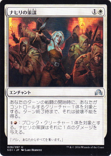 ![]() ![]() | SOI 028 ナヒリの策謀 エンチャント イニストラードを覆う影 U 色:白 マナコスト:(1)(白) あなたのターンの戦闘の開始時に、あなたがコントロールするクリーチャー1体を対象とする。ターン終了時まで、それは破壊不能を得る。 (1)(赤):ブロック・クリーチャー1体を対象とする。ナヒリの策謀はそれに1点のダメージを与える。 「ソリン、あなたからすべてを奪います。」 illust:LAKE HURWITZ |