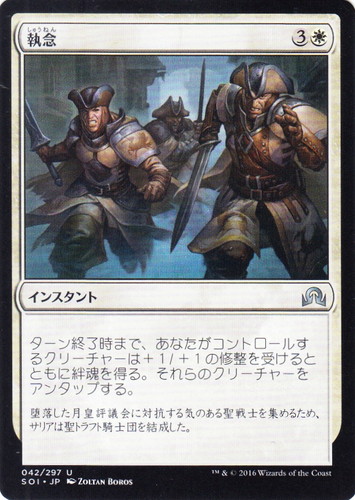 ![]() ![]() | SOI 042 執念 インスタント イニストラードを覆う影 U 色:白 マナコスト:(3)(白) ターン終了時まで、あなたがコントロールするクリーチャーは+1/+1の修整を受けるとともに絆魂を得る。それらのクリーチャーをアンタップする。 堕落した月皇評議会に対抗する気のある聖戦士を集めるため、サリアは聖トラフト騎士団を結成した。 illust:ZOLTAN BOROS |