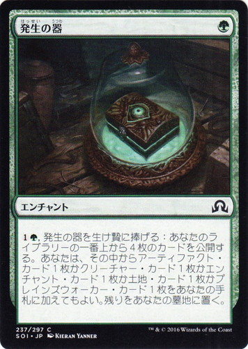 ![]() ![]() | SOI 237 発生の器 エンチャント イニストラードを覆う影 C 色:緑 マナコスト:(緑) (1)(緑), 発生の器を生け贄に捧げる:あなたのライブラリーの一番上から4枚のカードを公開する。あなたは、その中から、アーティファクト・カード1枚かクリーチャー・カード1枚かエンチャント・カード1枚か土地・カード1枚かプレインズウォーカー・カード1枚をあなたの手札に加えてもよい。残りをあなたの墓地に置く。 illust:KIERAN YANNER |