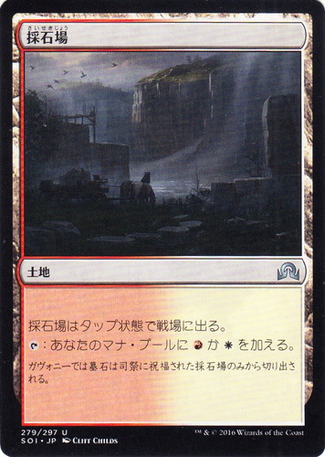 ![]() ![]() | SOI 279 採石場 土地 イニストラードを覆う影 U 色:赤/白 採石場はタップ状態で戦場に出る。 [T]:あなたのマナ・プールに(赤)か(白)を加える。 ガヴォニーでは墓石は司祭に祝福された採石場のみから切り出される。 illust:CLIFF CHILDS |