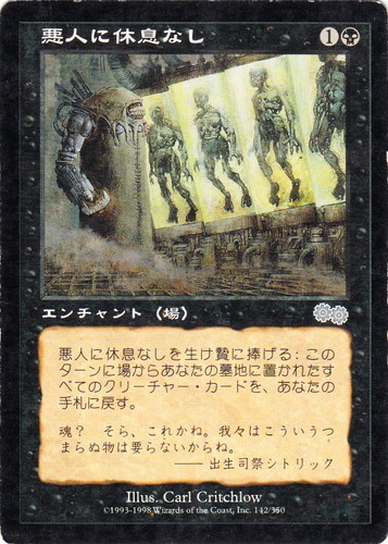 ![]() ![]() | USG 142 悪人に休息なし エンチャント ウルザズ・サーガ U 色:黒 エンチャント対象:場 マナコスト:(1)(黒) 悪人に休息なしを生け贄に捧げる:このターンに場からあなたの墓地に置かれたすべてのクリーチャー・カードを、あなたの手札に戻す。 魂?そら、これかね。我々はこういうつまらぬ物は要らないからね。 ――出生司祭シトリック illust:Carl Critchlow |