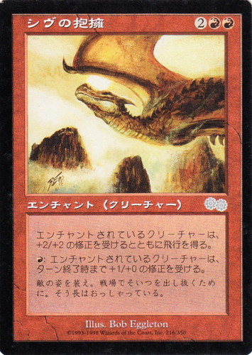 ![]() ![]() | USG 216 シヴの抱擁 エンチャント ウルザズ・サーガ U 色:赤 エンチャント対象:クリーチャー マナコスト:(2)(赤)(赤) エンチャントされているクリーチャーは、+2/+2の修正を受けるとともに飛行を得る。 (赤):エンチャントされているクリーチャーは、ターン終了時まで+1/+0の修正を受ける。 敵の姿を装え。戦場でそいつを出し抜くために。そう長はおっしゃっている。 illust:Bob Eggleton |