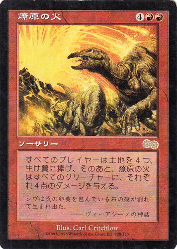 ![]() ![]() | USG 228 燎原の火 ソーサリー ウルザズ・サーガ R 色:赤 マナコスト:(4)(赤)(赤) すべてのプレイヤーは土地を4つ、生け贄に捧げ、そのあと、燎原の火はすべてのクリーチャーに、それぞれ4点のダメージを与える。 シヴは炎の卵黄を包んでいる石の殻が割れて生まれ出た。 ――ヴィーアシーノの神話 illust:Carl Critchlow |