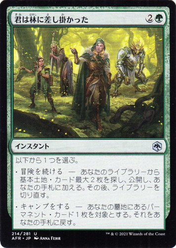 ![]() ![]() | AFR 214 君は林に差し掛かった インスタント フォーゴトン・レルム探訪 U 色:緑 マナコスト:(2)(緑) 以下から1つを選ぶ。 ・冒険を続ける―あなたのライブラリーから基本土地・カード最大2枚を探し、公開し、あなたの手札に加える。その後、ライブラリーを切り直す。 ・キャンプをする―あなたの墓地にあるパーマネント・カード1枚を対象とする。それをあなたの手札に戻す。 illust:ANNA FEHR |