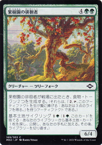 ![]() ![]() | MH2 169 果樹園の徘徊者 クリーチャー モダンホライゾン2 C 色:緑 サブタイプ:ツリーフォーク マナコスト:(4)(緑)(緑) パワー:6 タフネス:4 果樹園の徘徊者が戦場に出たとき、食物・トークン2つを生成する。(それらは「(2), [T], このアーティファクトを生け贄に捧げる:あなたは3点のライフを得る。」を持つアーティファクトである。) 基本土地サイクリング(1)(緑)((1)(緑), このカードを捨てる:あなたのライブラリーから基本土地・カード1枚を探し、公開し、あなたの手札に加える。その後、ライブラリーを切り直す。) illust:RAOUL VITALE |
