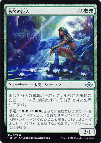 ![]() ![]() | MH2 179 永久の証人 クリーチャー モダンホライゾン2 U 色:緑 サブタイプ:人間・シャーマン マナコスト:(2)(緑)(緑) パワー:2 タフネス:1 永久の証人が戦場に出たとき、あなたの墓地からカード1枚を対象とする。それをあなたの手札に戻す。 永遠(5)(緑)(緑)((5)(緑)(緑), あなたの墓地からこのカードを追放する:マナ・コストを持たず黒で4/4でゾンビ・人間・シャーマンであることを除き、これのコピーであるトークン1体を生成する。永遠はソーサリーとしてのみ行う。) illust:DERUCHENKO ALEXANDER |