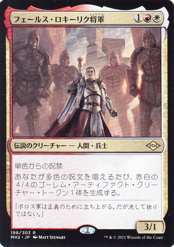 ![]() ![]() | MH2 198 フェールス・ロキーリク将軍 伝説のクリーチャー モダンホライゾン2 R 色:赤/白 サブタイプ:人間・兵士 マナコスト:(1)(赤)(白) パワー:3 タフネス:1 単色からの呪禁 あなたが多色の呪文を唱えるたび、赤白の4/4のゴーレム・アーティファクト・クリーチャー・トークン1体を生成する。 「ボロス軍は正義のために立ち上がる。だが決して独りではない。」 illust:MATT STEWART |