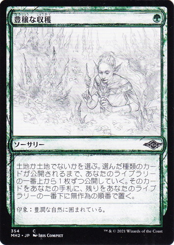 ![]() ![]() | MH2 354 豊穣な収穫 ソーサリー モダンホライゾン2 C 色:緑 マナコスト:(緑) 土地か土地でないかを選ぶ。選んだ種類のカードが公開されるまで、あなたのライブラリーの一番上から1枚ずつ公開していく。そのカードをあなたの手札に、残りをあなたのライブラリーの一番下に無作為の順番で置く。 印象:豊潤な自然に囲まれている。 illust:IRIS COMPIET |