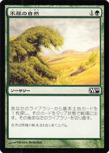 ![]() ![]() | M10 201 不屈の自然 ソーサリー 基本セット2010 C 色:緑 マナコスト:(1)(緑) あなたのライブラリーから基本土地カードを1枚探し、そのカードをタップ状態で戦場に出す。その後あなたのライブラリーを切り直す。 自然は問題の解決法を自ら育て上げる。 illust:Steven Belledin |