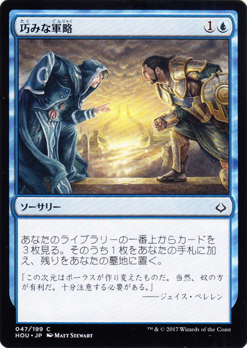 ![]() ![]() | HOU 047 巧みな軍略 ソーサリー 破滅の刻 C 色:青 マナコスト:(1)(青) あなたのライブラリーの一番上からカードを3枚見る。そのうち1枚をあなたの手札に加え、残りをあなたの墓地に置く。 「この次元はボーラスが作り変えたものだ。当然、奴の方が有利だ。十分注意する必要がある。」 ――ジェイス・ベレレン illust:MATT STEWART |