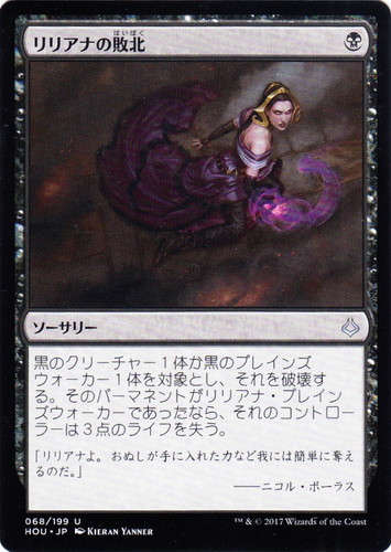 ![]() ![]() | HOU 068 リリアナの敗北 ソーサリー 破滅の刻 U 色:黒 マナコスト:(黒) 黒のクリーチャー1体か黒のプレインズウォーカー1体を対象とし、それを破壊する。そのパーマネントがリリアナ・プレインズウォーカーであったなら、それのコントローラーは3点のライフを失う。 「リリアナよ。おぬしが手に入れた力など我には簡単に奪えるのだ。」 ――ニコル・ボーラス illust:KIERAN YANNER |