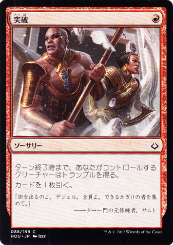 ![]() ![]() | HOU 088 突破 ソーサリー 破滅の刻 C 色:赤 マナコスト:(赤) ターン終了時まで、あなたがコントロールするクリーチャーはトランプルを得る。 カードを1枚引く。 「街を出るのよ、デジェル。全員よ。できるかぎりの者を集めて。」 ――ター一門の元修練者、サムト illust:IZZY |