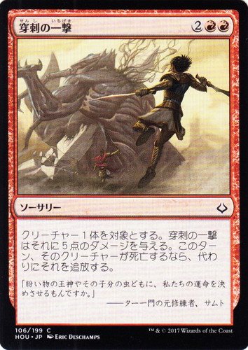 ![]() ![]() | HOU 106 穿刺の一撃 ソーサリー 破滅の刻 C 色:赤 マナコスト:(2)(赤)(赤) クリーチャー1体を対象とする。穿刺の一撃はそれに5点のダメージを与える。このターン、そのクリーチャーが死亡するなら、代わりにそれを追放する。 「紛い物の王神やその子分の虫どもに、私たちの運命を決めさせるもんですか。」 ――ター一門の元修練者、サムト illust:ERIC DESCHAMPS |
