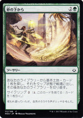 ![]() ![]() | HOU 111 砂の下から ソーサリー 破滅の刻 C 色:緑 マナコスト:(2)(緑) あなたのライブラリーから基本土地・カード1枚を探し、それをタップ状態で戦場に出し、その後あなたのライブラリーを切り直す。 サイクリング(2)((2), このカードを捨てる:カードを1枚引く。) 埋もれ弱っていたが、自然のささやき声がニッサを呼んだ。 illust:MAGALI VILLENEUVE |
