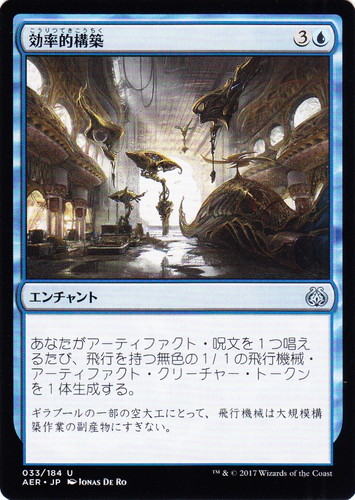 ![]() ![]() | AER 033 効率的構築 エンチャント 霊気紛争 U 色:青 マナコスト:(3)(青) あなたがアーティファクト・呪文を1つ唱えるたび、飛行を持つ無色の1/1の飛行機械・アーティファクト・クリーチャー・トークンを1体生成する。 ギラプールの一部の空大工にとって、飛行機械は大規模構築作業の副産物にすぎない。 illust:JONAS DE RO |