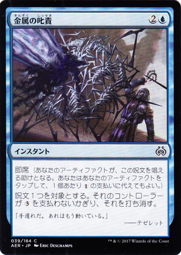 ![]() ![]() | AER 039 金属の叱責 インスタント 霊気紛争 C 色:青 マナコスト:(2)(青) 即席(あなたのアーティファクトが、この呪文を唱える助けとなる。あなたはあなたのアーティファクトをタップして、1個あたり(1)の支払いの代えてもよい。) 呪文1つを対象とする。それのコントローラーgた(3)を支払わないかぎり、それを打ち消す。 「手遅れだ。あれはもう動いている。」 ――テゼレット illust:ERIC DESCHAMPS |