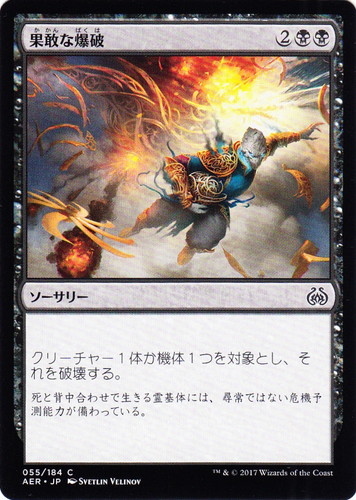![]() ![]() | AER 055 果敢な爆破 ソーサリー 霊気紛争 C 色:黒 マナコスト:(2)(黒)(黒) クリーチャー1体か機体1つを対象とし、それを破壊する。 死と背中合わせで生きる霊基体には、尋常ではない危機予測能力が備わっている。 illust:SVETLIN VELINOV |