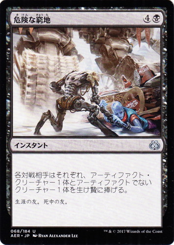 ![]() ![]() | AER 068 危険な窮地 インスタント 霊気紛争 U 色:黒 マナコスト:(4)(黒) 対戦相手はそれぞれ、アーティファクト・クリーチャー1体とアーティファクトでないクリーチャー1体を生け贄に捧げる。 生涯の友。死中の友。 illust:RYAN ALEXANDER LEE |