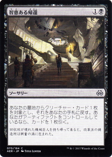 ![]() ![]() | AER 070 智恵ある帰還 ソーサリー 霊気紛争 C 色:黒 マナコスト:(1)(黒) あなたの墓地からクリーチャー・カード1枚を対象とし、それをあなたの手札に戻す。あなたがアーティファクトをコントロールしているなら、カードを1枚引く。 回収班が壊れた機械巨人を持ち帰ってくると、改革派の鋳造所は興奮の渦に包まれた。 illust:TITUS LUNTER |