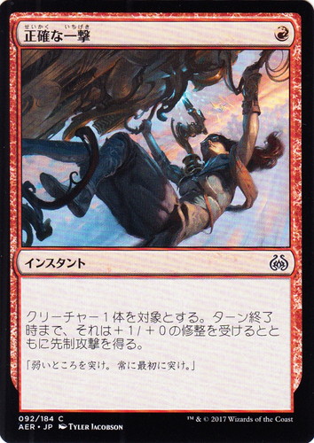 ![]() ![]() | AER 092 正確な一撃 インスタント 霊気紛争 C 色:赤 マナコスト:(赤) クリーチャー1体を対象とする。ターン終了時まで、それは+1/+0の修整を受けるとともに先制攻撃を得る。 「弱いところを突け。常に最初に突け。」 illust:TYLER JACOBSON |