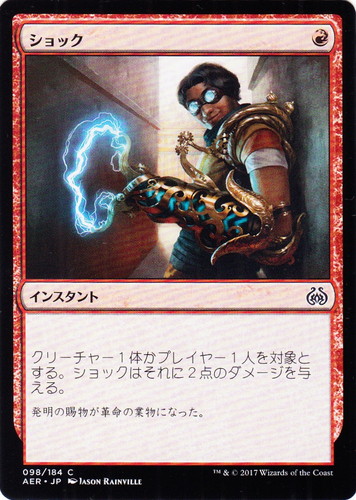 ![]() ![]() | AER 098 ショック インスタント 霊気紛争 C 色:赤 マナコスト:(赤) クリーチャー1体かプレイヤー1人を対象とする。ショックはそれに2点のダメージを与える。 発明の賜物が革命の業物になった。 illust:JASON RAINVILLE |