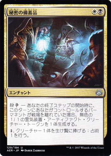![]() ![]() | AER 129 秘密の備蓄品 エンチャント 霊気紛争 U 色:白/黒 マナコスト:(白)(黒) 紛争―あなたの終了ステップの開始時に、このターンにあなたがコントロールするパーマネントが戦場を離れていた場合、無色の1/1の霊気装置・アーティファクト・クリーチャー・トークンを1体生成する。 (1), クリーチャー1体を生け贄に捧げる:[[sp:占術]]1を行う。 illust:DAREK ZABROCKI |