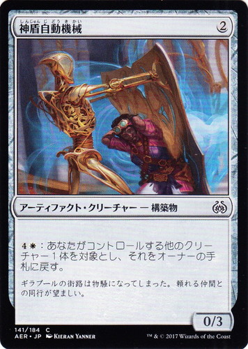 ![]() ![]() | AER 141 神盾自動機械 アーティファクト・クリーチャー 霊気紛争 C 色:無色 サブタイプ:構築物 マナコスト:(2) パワー:0 タフネス:3 (4)(白):あなたがコントロールする他のクリーチャー1体を対象とし、それをオーナーの手札に戻す。 ギラプールの街路は物騒になってしまった。頼れる仲間との同行が望ましい。 illust:KIERAN YANNER |
