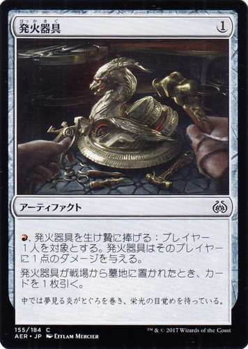 ![]() ![]() | AER 155 発火器具 アーティファクト 霊気紛争 C 色:無色 マナコスト:(1) (赤), 発火器具を生け贄に捧げる:プレイヤー1人を対象とする。発火器具はそのプレイヤーに1点のダメージを与える。 発火器具が戦場から墓地に置かれたとき、カードを1枚引く。 中では夢見る炎がとぐろを巻き、栄光の目覚めを待っている。 illust:EFFLAM MERCIER |