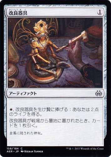 ![]() ![]() | AER 158 改良器具 アーティファクト 霊気紛争 C 色:無色 マナコスト:(1) (白), 改良器具を生け贄に捧げる:あなたは2点のライフを得る。 改良器具が戦場から墓地に置かれたとき、カードを1枚引く。 illust:KIERAN YANNER |