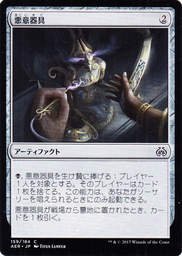 ![]() ![]() | AER 159 悪意器具 アーティファクト 霊気紛争 C 色:無色 マナコスト:(1) (黒), 悪意器具を生け贄に捧げる:プレイヤー1人を対象とする。そのプレイヤーはカード1枚を捨てる。この能力は、あなたがソーサリーを唱えられるときにのみ起動できる。 悪意器具が戦場から墓地に置かれたとき、カードを1枚引く。 illust:TITUS LUNTER |