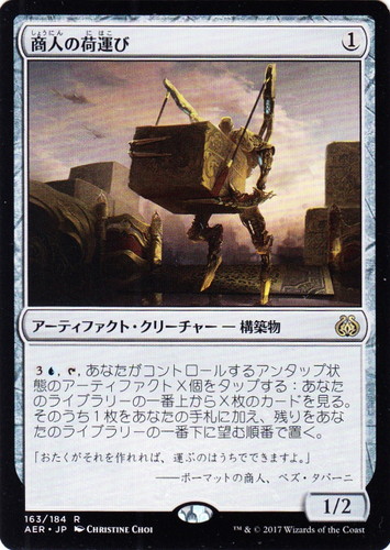 ![]() ![]() | AER 163 商人の荷運び アーティファクト・クリーチャー 霊気紛争 R 色:無色 サブタイプ:構築物 マナコスト:(1) パワー:1 タフネス:2 (3)(青), [T], あなたがコントロールするアンタップ状態のアーティファクトX個をタップする:あなたのライブラリーの一番上からX枚のカードを見る。そのうち1枚をあなたの手札に加え、残りをあなたのライブラリーの一番下に望む順番で置く。 「おたくがそれを作れれば、運ぶのはうちでできますよ。」 ――ポーマットの商人、ベズ・タパーニ illust:CHRISTINE CHOI |