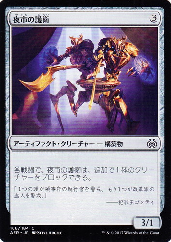 ![]() ![]() | AER 166 夜市の護衛 アーティファクト・クリーチャー 霊気紛争 C 色:無色 サブタイプ:構築物 マナコスト:(3) パワー:3 タフネス:1 各戦闘で、夜市の護衛は、追加で1体のクリーチャーをブロックできる。 「1つの頭が領事府の執行官を警戒、もう1つが改革派の盗人を警戒。」 ――犯罪王ゴンティ illust:STEVE ARGYLE |