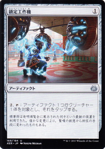 ![]() ![]() | AER 168 鎮定工作機 アーティファクト 霊気紛争 U 色:無色 マナコスト:(1) (2), [T]:アーティファクト1つかクリーチャー1体を対象とし、それをタップする。 領事府は発明博覧会に展示された何千という最新の装置を利用できた。僅かな変更により、驚嘆の創意から抑圧の手段に変わったものである。 illust:JOSEPH MEEHAN |