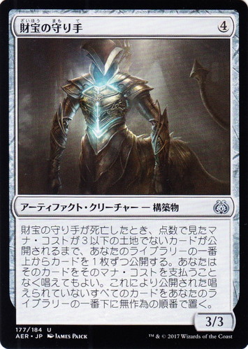 ![]() ![]() | AER 177 財宝の守り手 アーティファクト・クリーチャー 霊気紛争 U 色:無色 サブタイプ:構築物 マナコスト:(4) パワー:3 タフネス:3 財宝の守り手が死亡したとき、点数で見たマナ・コストが3以下の土地でないカードが公開されるまで、あなたのライブラリーの一番上からカードを1枚ずつ公開する。あなたはそのカードをそのマナ・コストを支払うことなく唱えてもよい。これにより公開された唱えられていないすべてのカードをあなたのライブラリーの一番下に無作為の順番で置く。 illust:JAMES RYMAN |