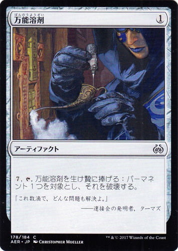 ![]() ![]() | AER 178 万能溶剤 アーティファクト 霊気紛争 C 色:無色 マナコスト:(1) (7), [T], 万能溶剤を生け贄に捧げる:パーマネント1つを対象とし、それを破壊する。 「これ数滴で、どんな問題も解決よ。」 ――速接会の発明者、ターマズ illust:CHRISTOPHER MOELLER |
