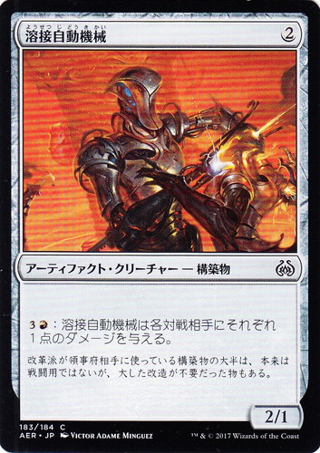 ![]() ![]() | AER 183 溶接自動機械 アーティファクト・クリーチャー 霊気紛争 C 色:無色 サブタイプ:構築物 マナコスト:(2) パワー:2 タフネス:1 (3)(赤):溶接自動機械は各対戦相手にそれぞれ1点のダメージを与える。 改革派が領事府相手に使っている構築物の大半は、本来は戦闘用ではないが、大した改造が不要だった物もある。 illust:VICTOR ADAME MINGUEZ |