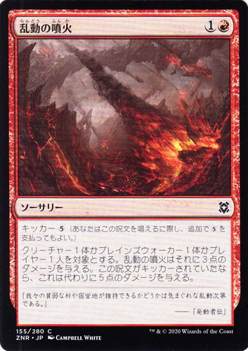 ![]() ![]() | ZNR 155 乱動の噴火 ソーサリー ゼンディカーの夜明け C 色:赤 マナコスト:(1)(赤) キッカー(5)(あなたはこの呪文を唱えるに際し、追加で(5)を支払ってもよい。) クリーチャー1体かプレインズウォーカー1体を対象とする。乱動の噴火はそれに3点のダメージを与える。この呪文がキッカーされていたなら、これは代わりに5点のダメージを与える。 「我々の貧弱な村や宿営地が維持できるかどうかは気まぐれな乱動次第である。」 ――「発動者伝」 illust:CAMPBELL WHITE |