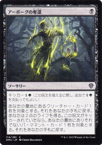 ![]() ![]() | DMU 114 アーボーグへの奪還 ソーサリー 団結のドミナリア C 色:黒 マナコスト:(黒) キッカー(1)(緑)(この呪文を唱えるに際し、追加で(1)(緑)を支払ってもよい。) あなたの墓地にあるクリーチャー・カード1枚を対象とする。それをあなたの手札に戻す。あなたは2点のライフを得る。この呪文がキッカーされていたなら、あなたの墓地にありそれでないパーマネント・カード1枚を対象とする。それをあなたの手札に戻す。 illust:CRISTI BALANESCU |