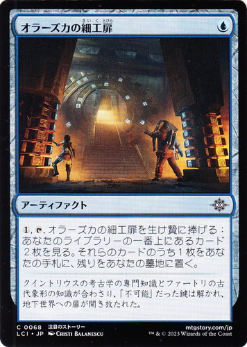 ![]() ![]() | LCI 0068 オラーズカの細工扉 アーティファクト イクサラン:失われし洞窟 C 色:青 マナコスト:(青) (1), [T], オラーズカの細工扉を生け贄に捧げる:あなたのライブラリーの一番上にあるカード2枚を見る。それらのカードのうち1枚をあなたの手札に、残りをあなたの墓地に置く。 クイントリウスの考古学の専門知識とファートリの古代象形の知識が合わさり、「不可能」だった鍵は解かれ、地下世界への扉が解き放たれた。 illust:CRISTI BALANESCU |