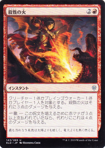 ![]() ![]() | ELD 143 殺戮の火 ソーサリー エルドレインの王権 U 色:赤 マナコスト:(2)(赤) クリーチャー1体かプレインズウォーカー1体かプレイヤー1人を対象とする。殺戮の火はそれに3点のダメージを与える。 一徹―この呪文を唱えるために赤マナが3点以上支払われていたなら、代わりにこれは4点のダメージを与える。 最も汚れなき美徳は太陽よりも眩しく、竜火よりも熱く燃える。 illust:HEONHWA CHOE |